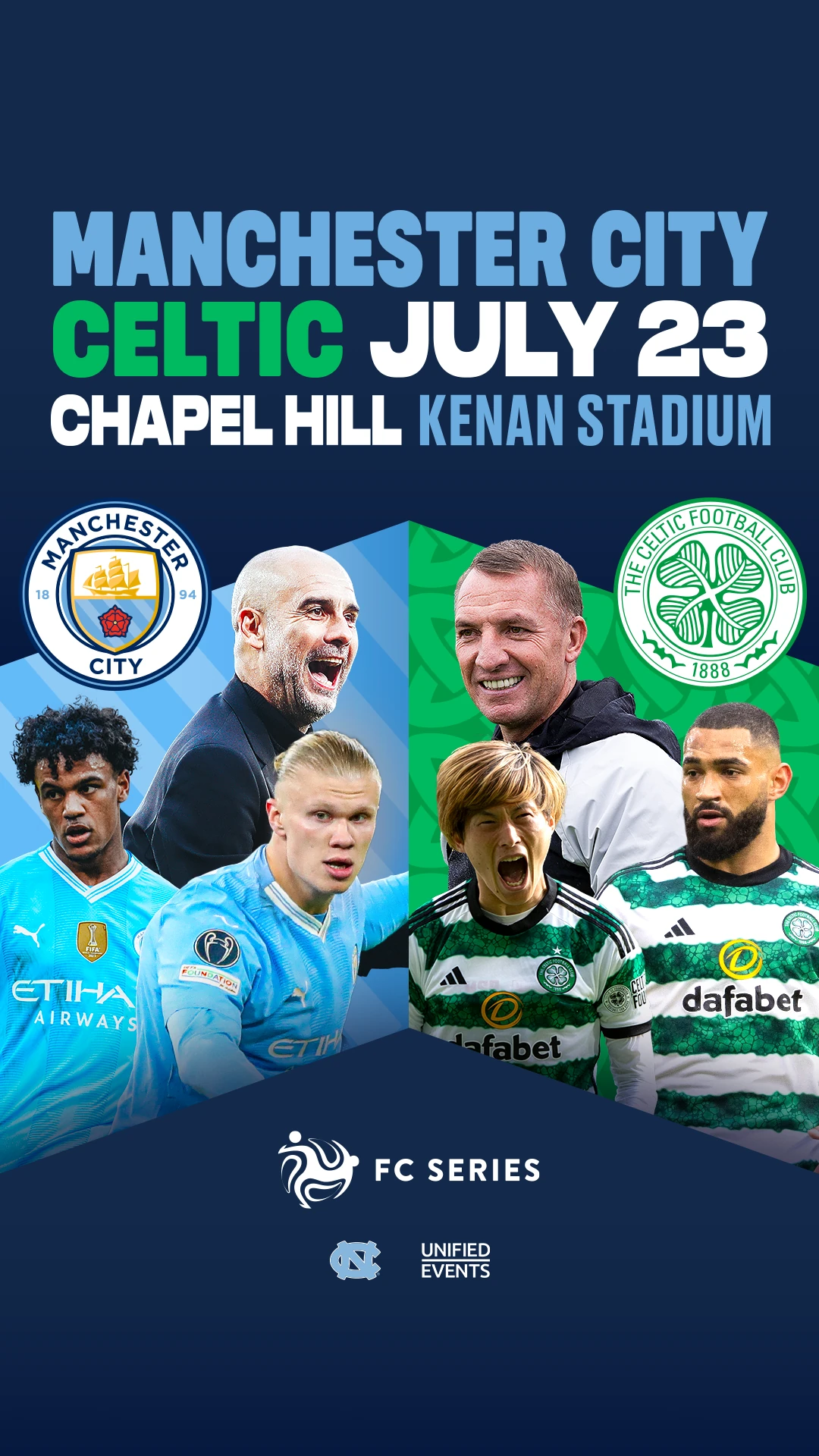 Unified Events is excited to be returning to partner with the University of North Carolina to welcome international club soccer to Kenan Stadium when England’s Manchester City and Scotland’s Celtic FC will face off against each other on Tuesday, July 23, 2024.